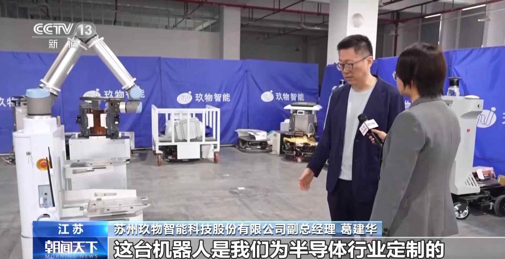 苏州玖物智能科技股份有限公司副总经理 葛建华:这台机器人是我们为半导体行业定制的。我们现在抓取的这个设备,其实是一台晶圆盒,这个晶圆片模型其实特别薄、特别脆,震动稍微厉害一点就会有裂痕,机械臂的精度可以达到0.1毫米。