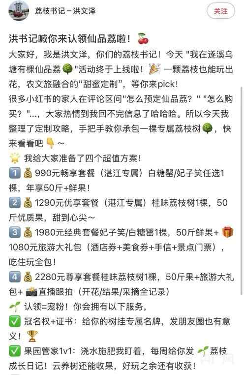 在“内容种草”环节,他们将“仙品荔”的百年种植历史转化为“古荔守护人”系列故事,结合火山灰土壤、咸淡水浇灌等地理优势,打造“海水荔枝”差异化标签;通过“流量运营”,通过在小红书等社交平台发起“荔枝花开打卡挑战赛”,吸引超5万用户参与;而“资源整合”则串联起文旅、电商、帮扶单位,推出“湾区市场+遂溪产品”等协作模式,让果实从“小特产”升级为“大产业”。