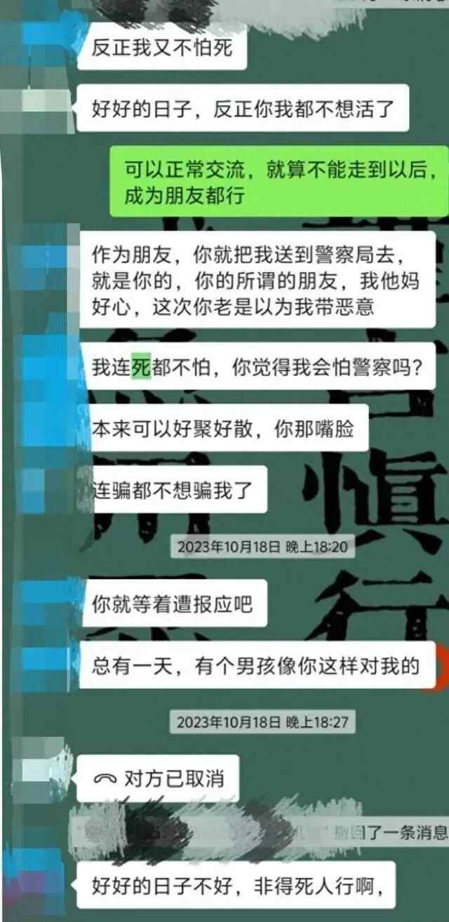 2024年10月18日,民警调解结束后,覃某某在当晚还给陈女士发去了威胁的消息。“反正我又不怕死,好好的日子,反正你我都不想活了。”“我连死都不怕,你觉得我会怕警察吗?”