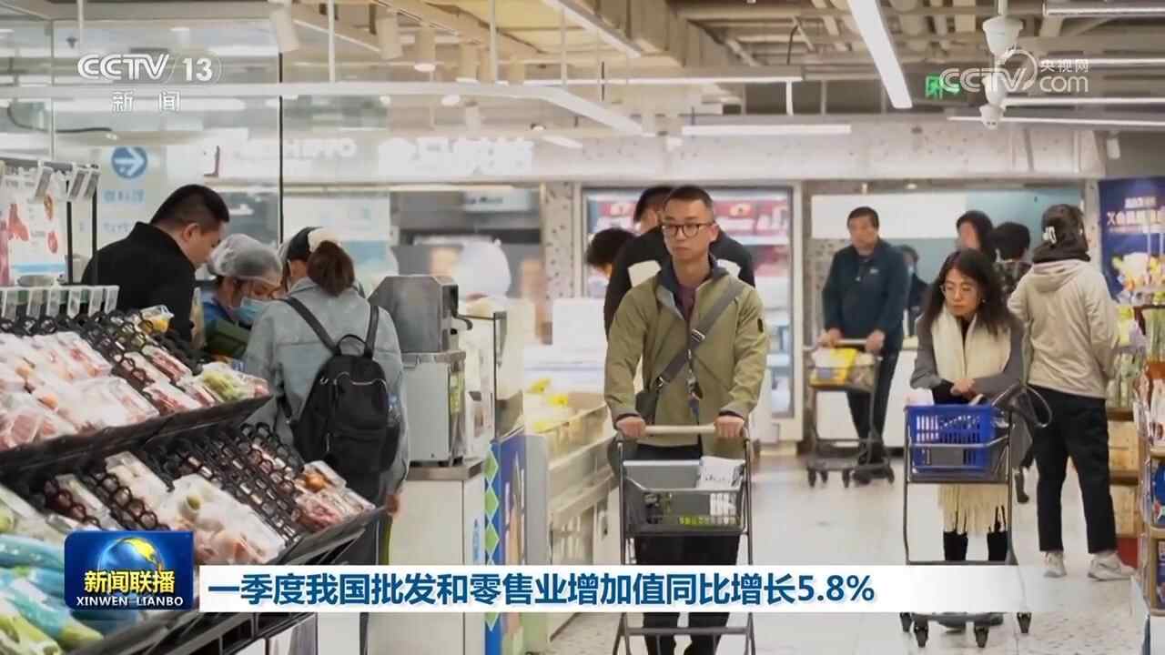 央视网消息(新闻联播):商务部数据显示,一季度,我国批发和零售业增加值3.3万亿元,同比增长5.8%,占GDP比重达到10.4%。
