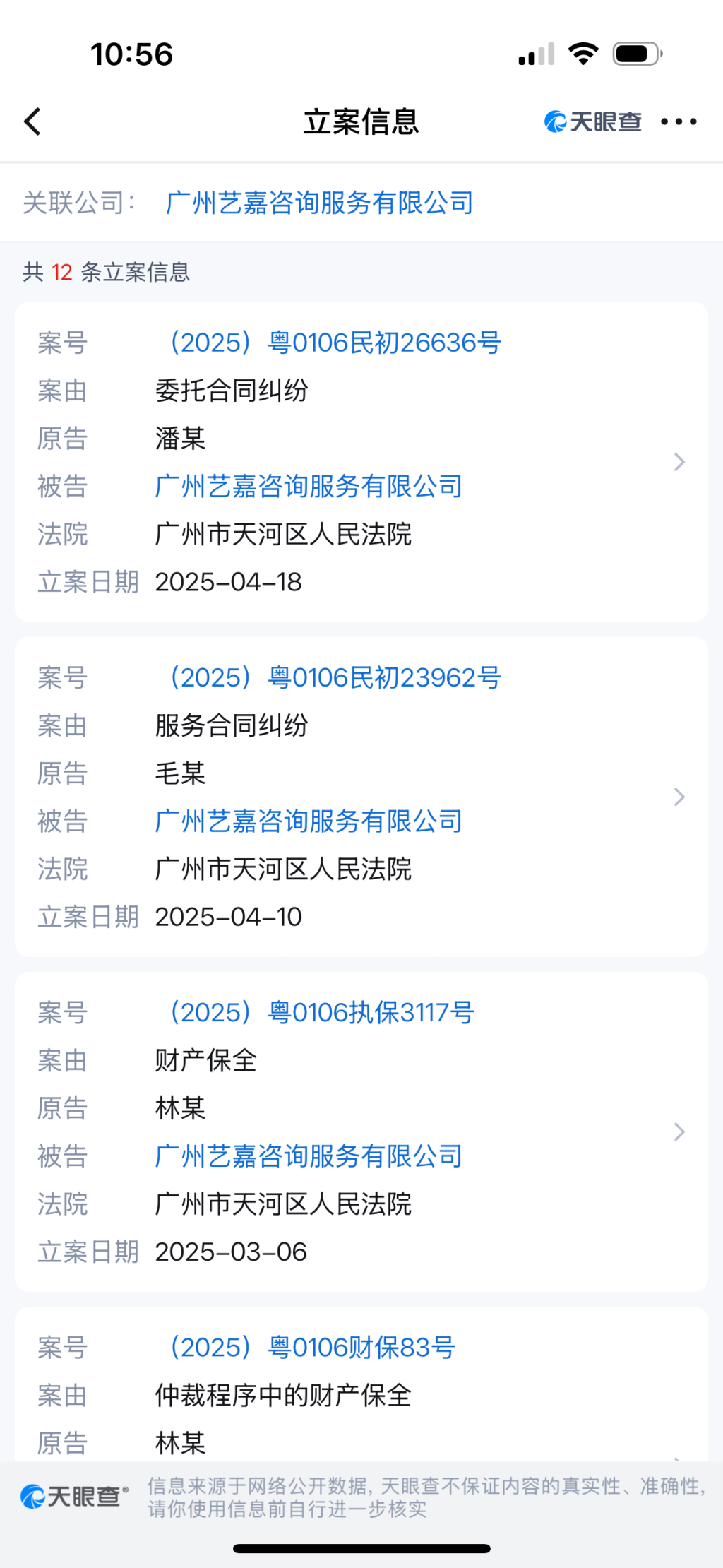 值得注意的是,2023年11月底,懿行商贸公司更名为广州艺嘉咨询服务有限公司(以下简称“艺嘉咨询公司”),其法定代表人也进行了变更。该公司于2025年3月被广州市天河区市场监督管理局列入企业经营异常名录。自2024年7月起,因合同纠纷、服务合同纠纷等,该公司已多次被起诉,相关立案信息有12条。