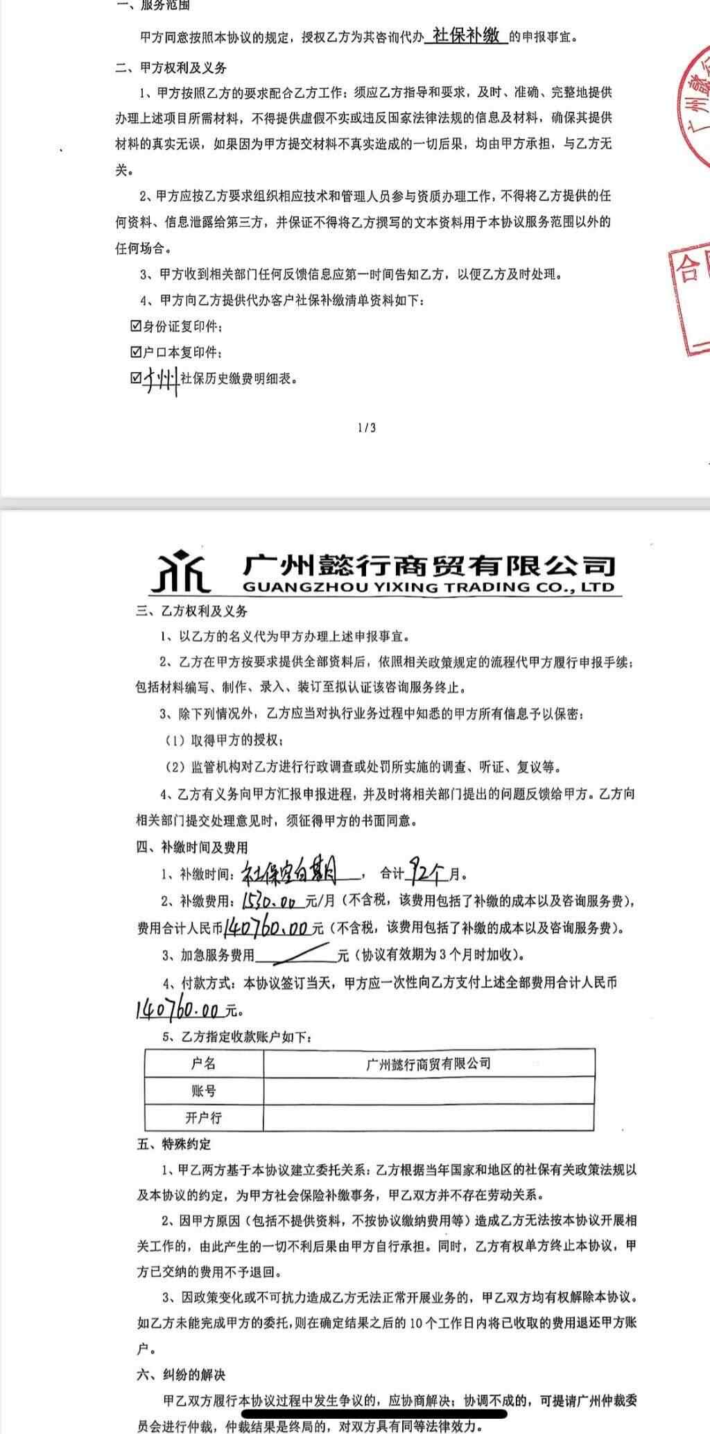 多位广州居民近日向记者反映称,因在网络上看到一次性补缴社保广告被吸引,他们与广州懿行商贸有限公司(以下简称“懿行商贸公司”)签订协议,一次性支付数万元、十多万元用来补缴社保。然而,几年过去了,该公司一直没有帮他们补缴社保。