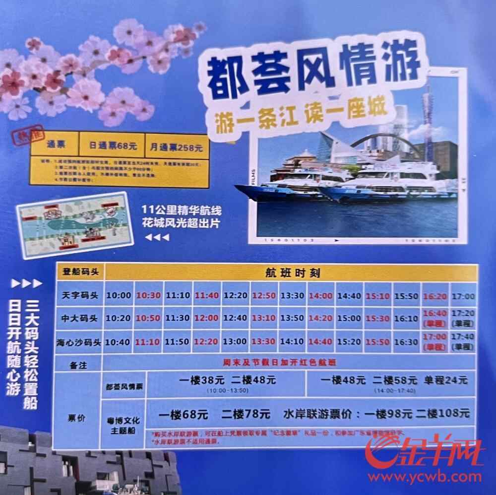 目前,天字码头、中大码头和海心沙西区码头的珠江日游平常每天设置7个航班,节假日、“五一”假期将加密至13个航班。“粤博文化”主题游船航线后续将视客流情况,增加黄沙码头和白鹅潭艺术中心码头,游客可欣赏白鹅潭艺术中心、白天鹅宾馆、人民桥等沿途风光,进一步丰富游客的文旅体验。