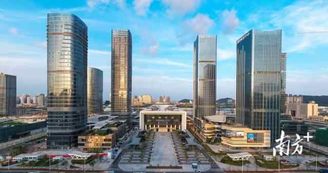 日落时分,俯瞰云海下的澳门与横琴金融岛。南方+拍客 陈烁明 摄