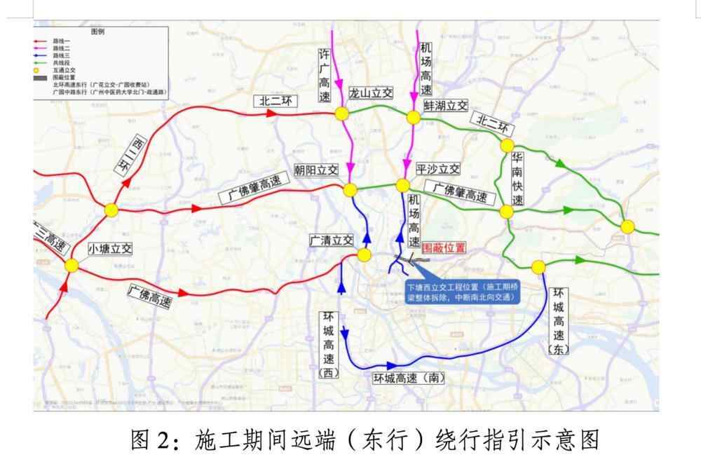 路线一:广三高速→小塘立交→西二环→北二环;广佛高速→广清立交→许广高速→广佛肇高速;