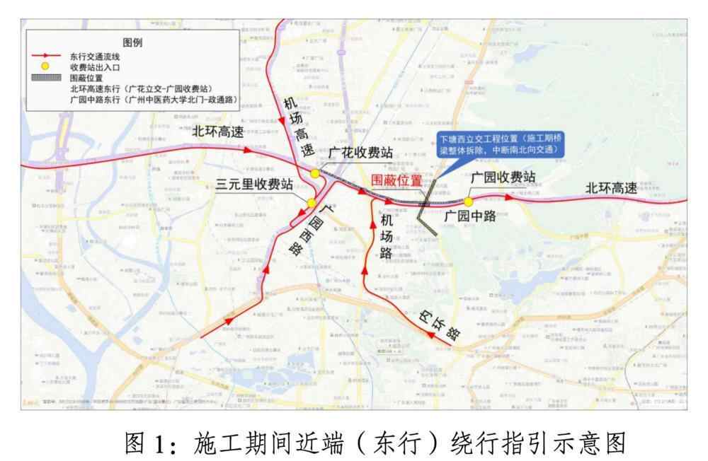 广花收费站/三元里收费站/机场路→广园西路→广园中路(西往东车辆可借北侧两车道行驶)→广园收费站→北环高速