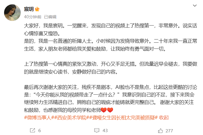 22日晚,宸玥发文回应:“我是一名普通的听障人士。小时候因为发烧导致意外。二十年来我一直正常生活,家人朋友老师都给我关爱和鼓励,让我始终有勇气面对一切。上了热搜第一心情真的紧张又激动,开心又手足无措。但流量迟早会褪去,我要做的就是继续安心读书,安静做好自己的内容。