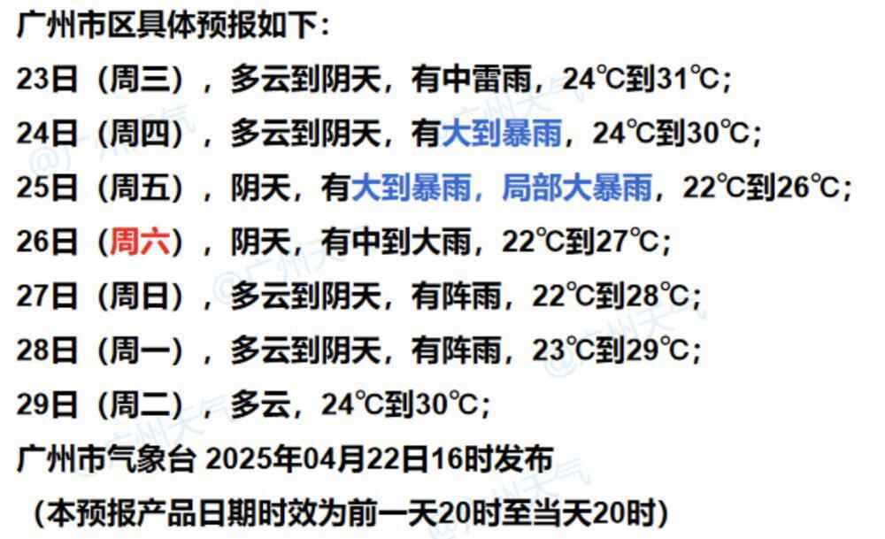 25日,珠三角、粤东市县有大雨到暴雨局部大暴雨,雷州半岛有阵雨,其余市县有中到大雨局部暴雨。最高气温:雷州半岛28℃~30℃,粤北和珠江三角洲北部市县22℃~24℃,其余市县25℃~27℃。