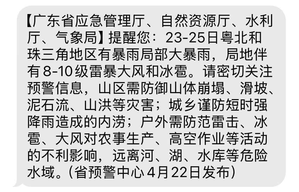 广东省气象局4月22日追加提醒:本次暴雨叠加强对流天气过程,粤北山区注意防御强降水及其导致的地质灾害、中小河流洪水、农田渍涝等次生灾害;珠三角地区短时雨势强烈,注意防范城乡积涝灾害。全省各地均需注意防范局地的雷雨大风、冰雹和雷电等强对流天气带来的安全风险。近期广东各地早晚部分市县雾时能见度低,注意交通安全。