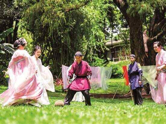 4月16日下午,阳光洒在兰圃绿意盎然的大草坪上,生机盎然的落羽杉与古色古香的蹴鞠相映成趣,将市民们拉回到千年前的时光。