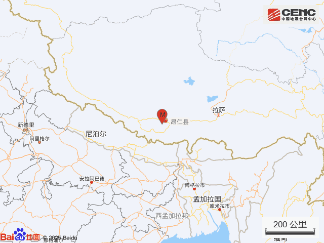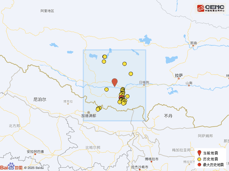 历史地震:根据中国地震台网速报目录,震中周边200公里内近5年来发生3级以上地震共123次,最大地震是2025年1月7日在西藏日喀则市定日县发生的6.8级地震(距离本次震中97公里),按震级大小前50次历史地震分布如图。
