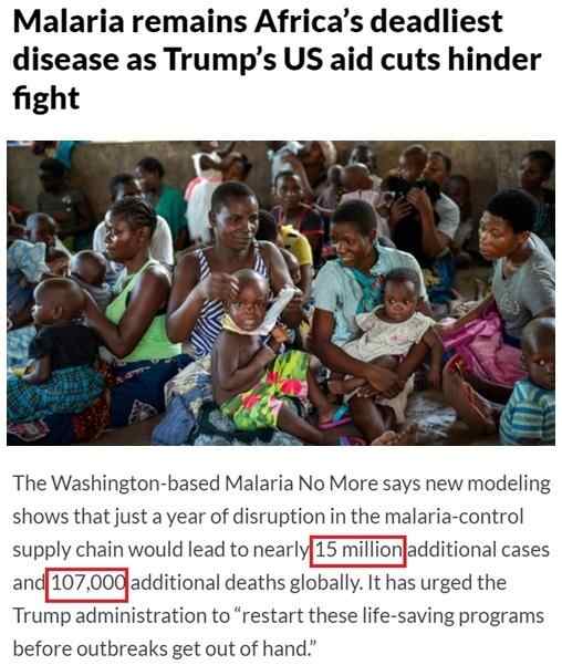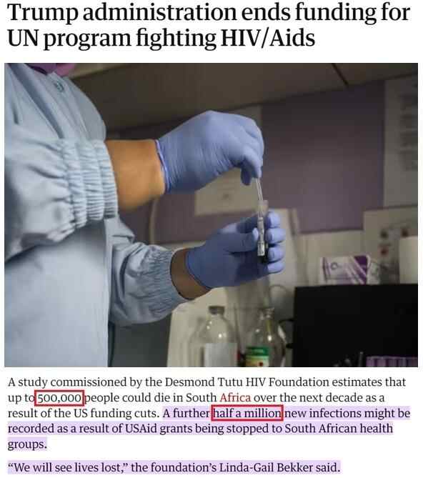 南非德斯蒙德·图图艾滋病中心主任琳达-盖尔·贝克尔告诉记者,美国取消对当地抗艾组织的资助将导致“超过50万不必要的死亡以及多达50万新增感染病例”,使有关方面“过去25年的所有努力付诸东流”。