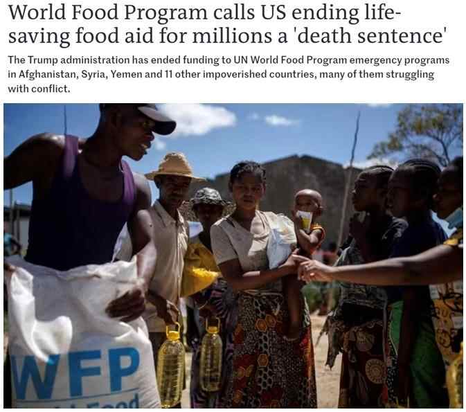 世界粮食计划署警告说,美国中断紧急粮食援助相当于是对千百万面临极端饥饿的民众“判处死刑”。