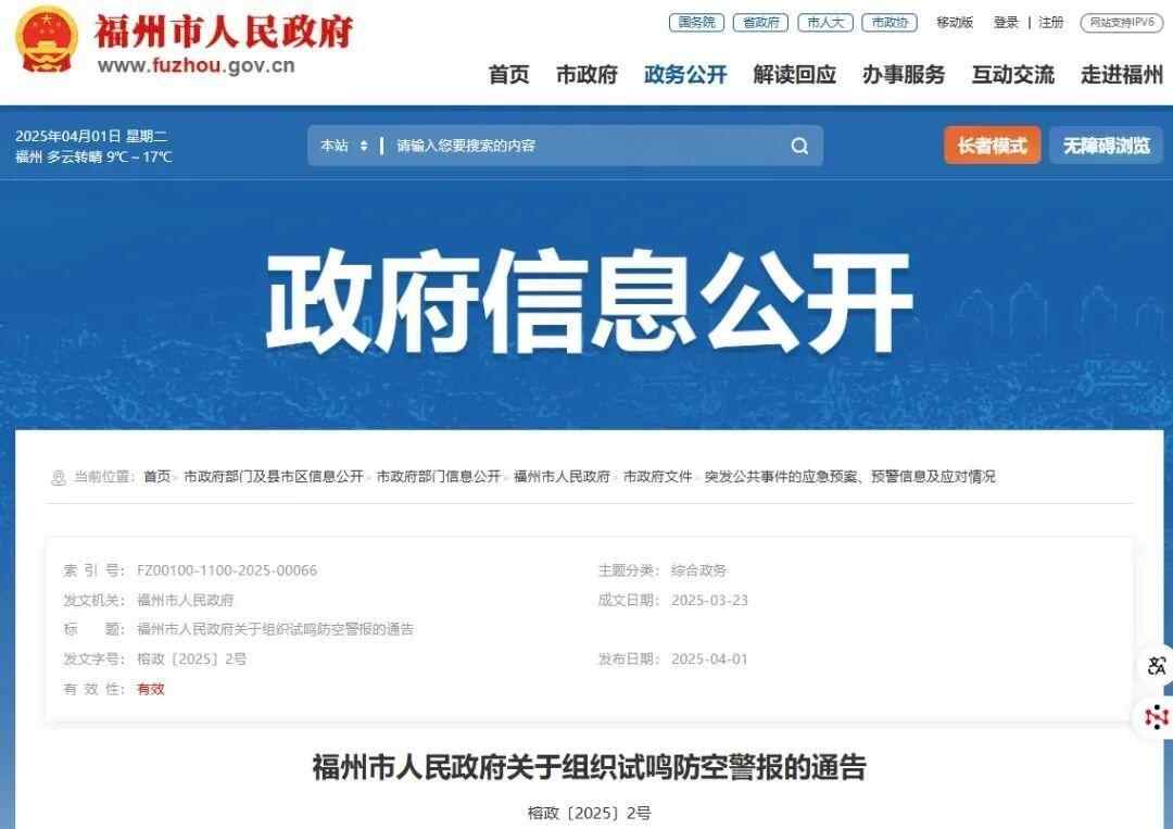 据福州市国防动员办公室工作人员介绍,防空警报信号按照预先警报、空袭警报、解除警报的顺序进行试鸣。试鸣期间,全市一切活动照常,市民保持正常的工作和生活秩序。