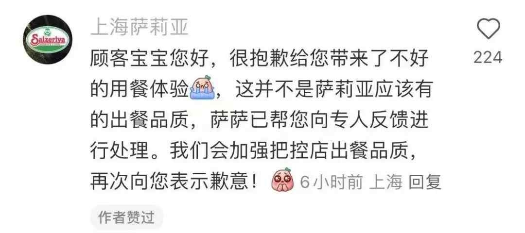 记者注意到,在当事人原帖下,@上海萨莉亚 官方回复称:“顾客宝宝您好,很抱歉给您带来了不好的用餐体验,这并不是萨莉亚应该有的出餐品质,萨萨已帮您向专人反馈进行处理。我们会加强把控店出餐品质,再次向您表示歉意!”
