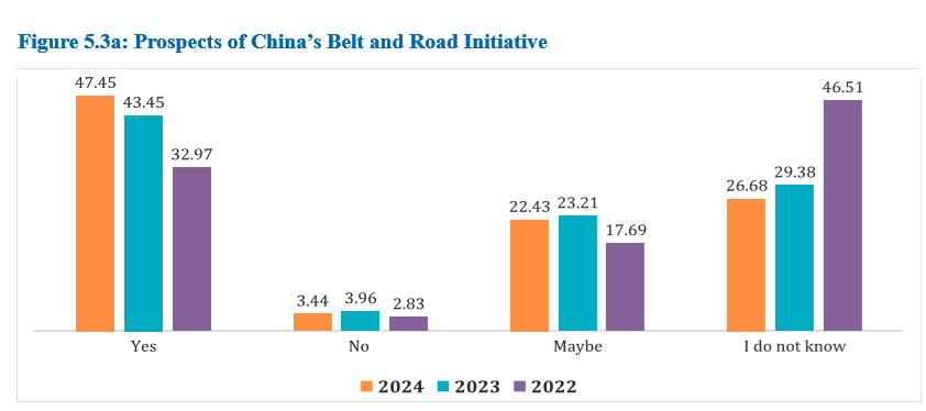 许多受访者认为中国的经济倡议,如共建“一带一路”倡议,能够推动孟加拉国的增长。