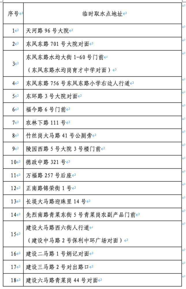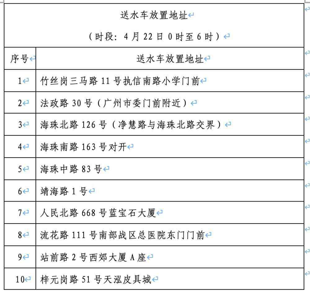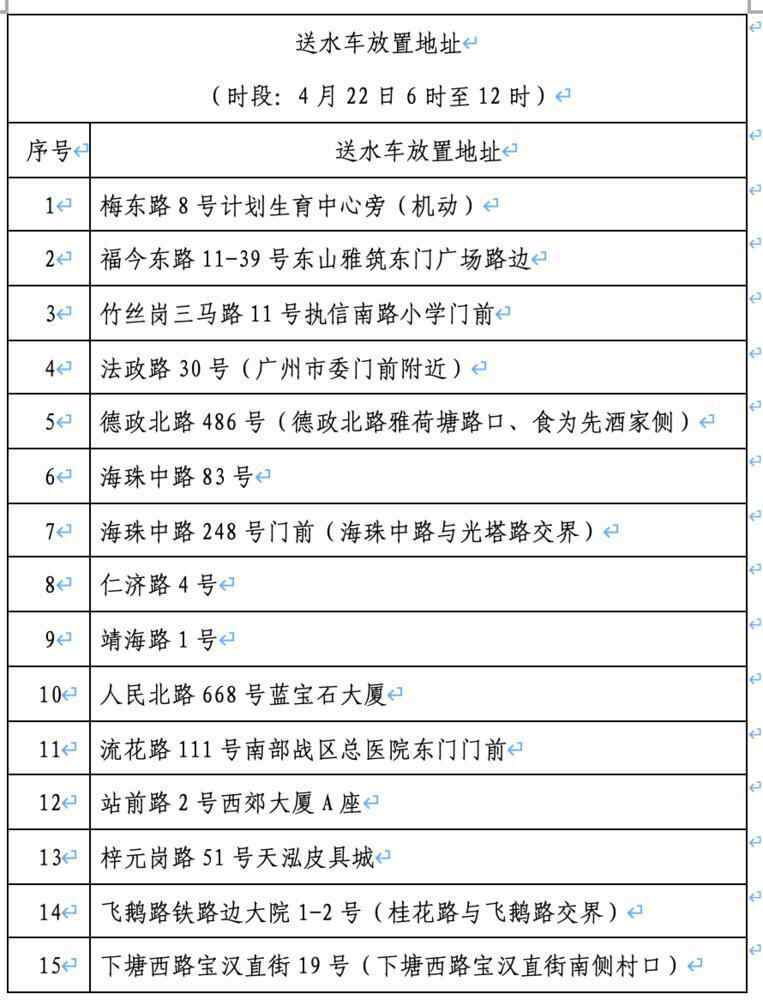 为保障市民在凌晨至第二天上午时段用水,广州自来水公司将在4月22日0时至6时安排10辆应急送水车,4月22日6时至12时安排17辆应急送水车提供应急供水服务,并在沿线及周边设置54个临时取水点供市民取用水。