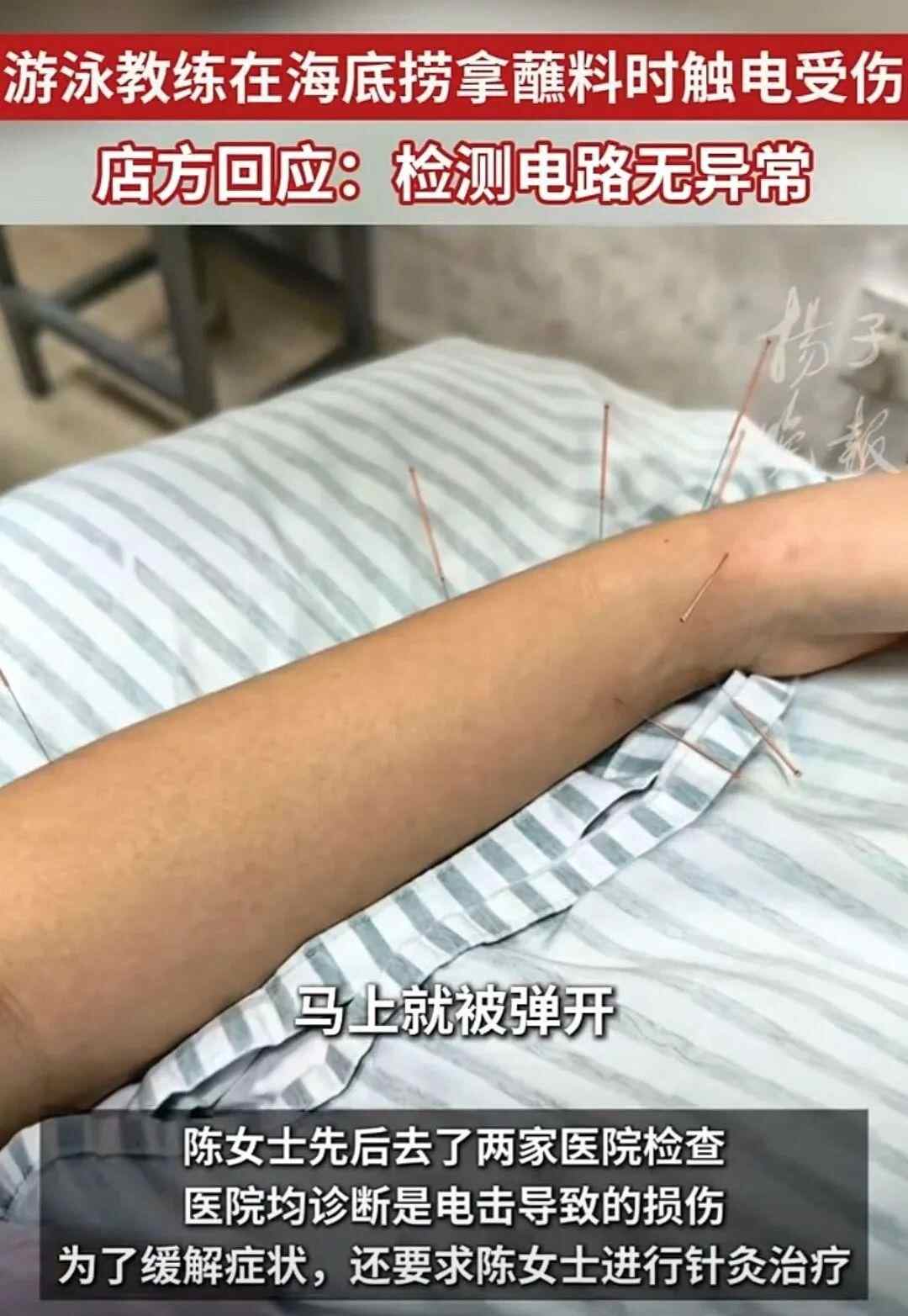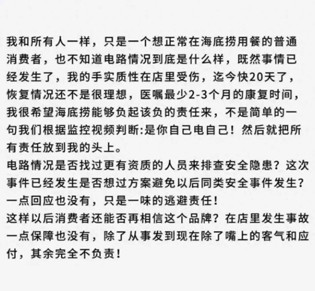 据此前报道,苏州陈女士发帖称于3月30日在海底捞就餐时,触碰到蘸料台的金属边缘导致左手触电受伤,之后持续出现僵硬、乏力、麻木症状,就医治疗大半个月后仍需再进行两到三个月的康复治疗。身为游泳教练的陈女士希望海底捞承担3000多元医药费和后续误工费,但海底捞门店负责人称陈女士拿调料前扎了头发,所穿衣服也是容易引起静电的材质,因此不排除是陈女士自己的责任。