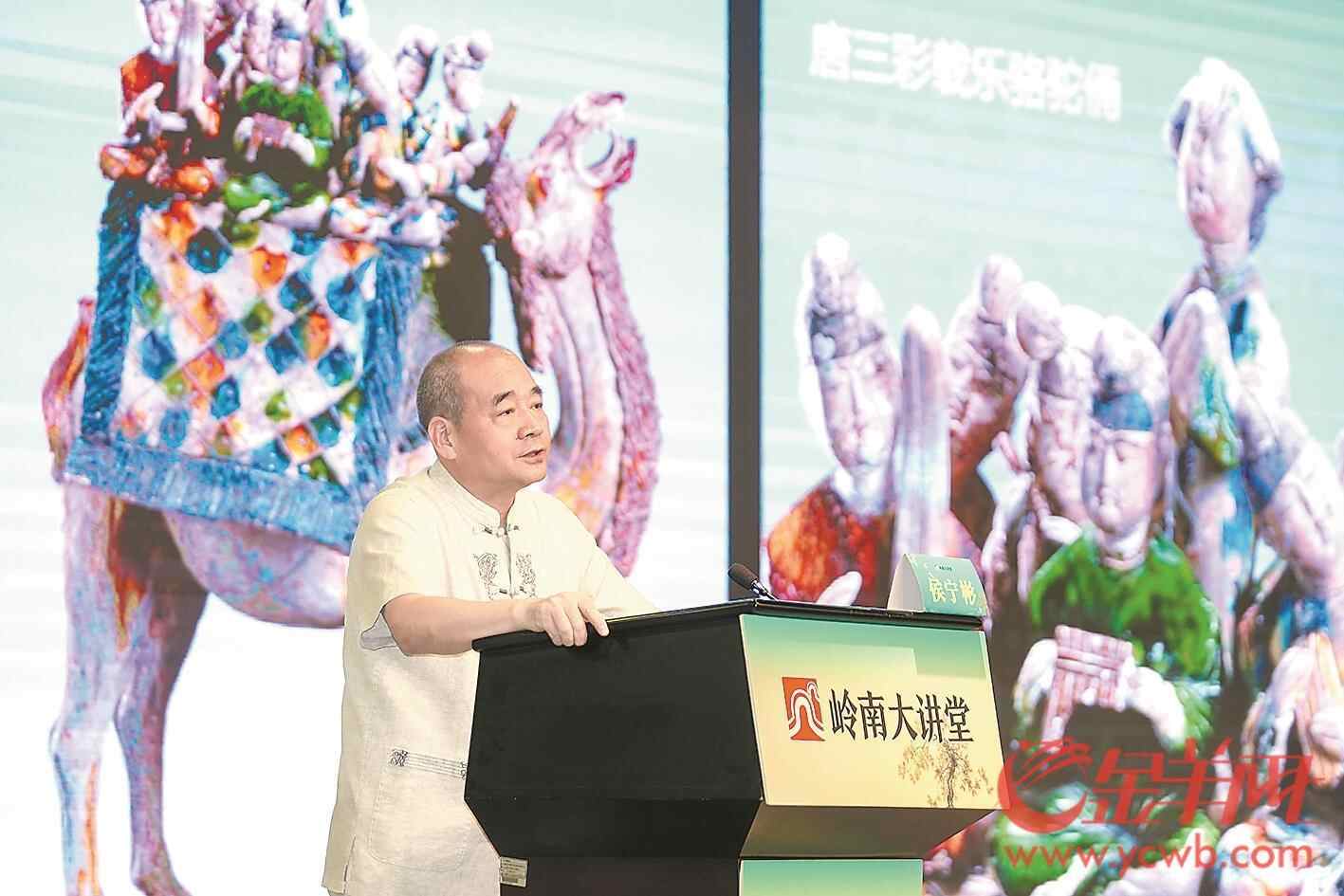 广州南越王墓出土的波斯蒜头纹银盒、茂陵出土的西汉鎏金铜马、唐三彩骆驼载乐俑、敦煌莫高窟323窟壁画《张骞出使西域图》……在讲座现场,侯宁彬解读海量精美文物图片及其背后的故事,讲述了东西方、南北方文明交融的璀璨历程,为观众带来一场跨越千年的文明对话。