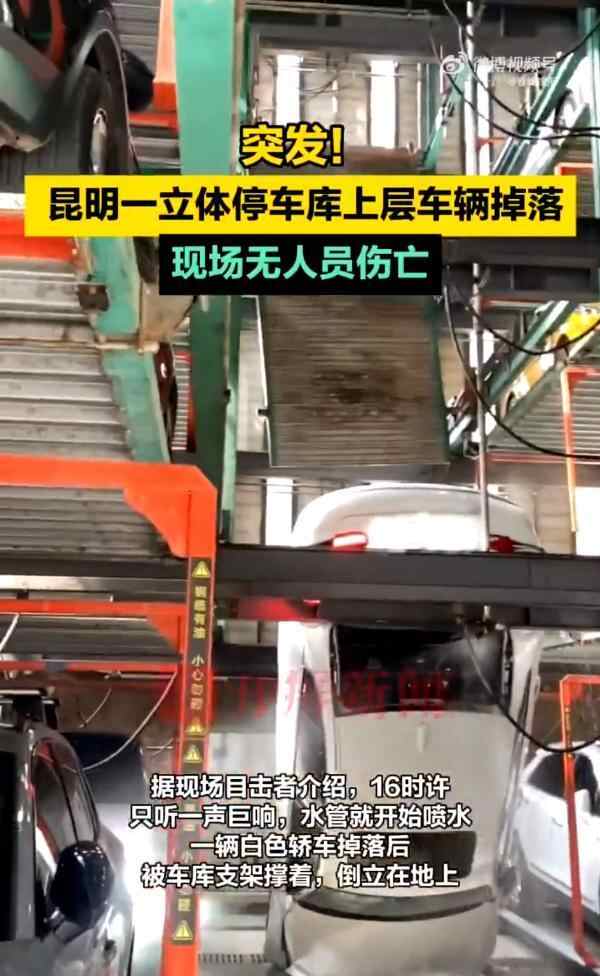 4月19日,在昆明市C86山茶坊,停在立体停车库上层的一车辆突然掉落。