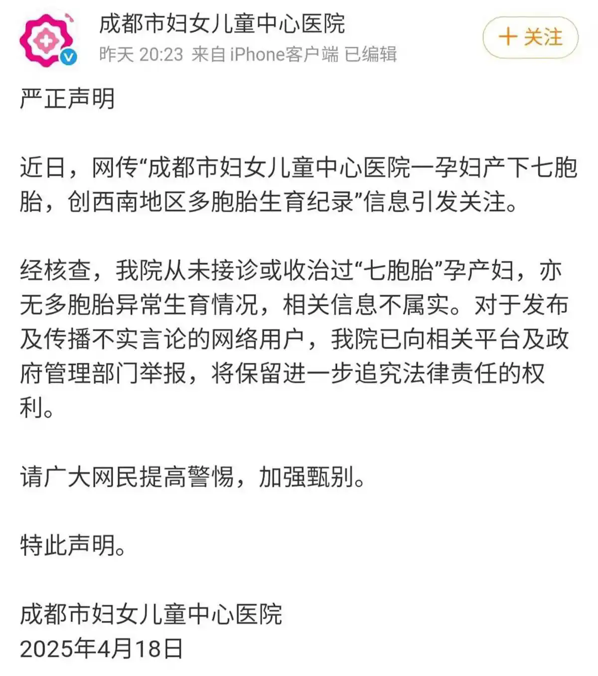 记者注意到,4月18日晚8时,成都市妇女儿童中心医院官微发布声明表示,近日,网传“成都市妇女儿童中心医院一孕妇产下七胞胎,创西南地区多胞胎生育纪录”信息引发关注。经核查,该院从未接诊或收治过“七胞胎”孕产妇,亦无多胞胎异常生育情况,相关信息不属实。对于发布及传播不实言论的网络用户,该院已向相关平台及政府管理部门举报,将保留进一步追究法律责任的权利。