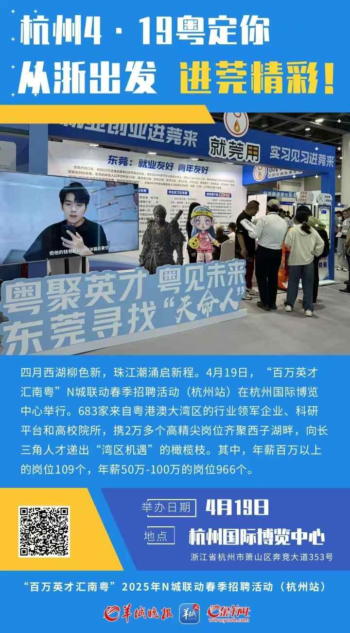 四月西湖柳色新,珠江潮涌启新程。4月19日,“百万英才汇南粤”N城联动春季招聘活动(杭州站)在杭州国际博览中心举行。683家来自粤港澳大湾区的行业领军企业、科研平台和高校院所,携2万多个高精尖岗位齐聚西子湖畔,向长三角人才递出“湾区机遇”的橄榄枝。其中,年薪百万元以上的岗位109个,年薪50万-100万元的岗位966个。