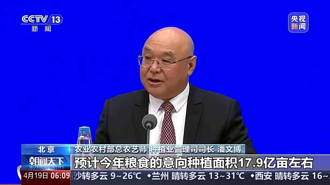 农业农村部总农艺师 种植业管理司司长 潘文博:据农情调度,预计今年粮食意向种植面积17.9亿亩左右,其中春播粮食面积9.6亿亩,均比上年有所增加。