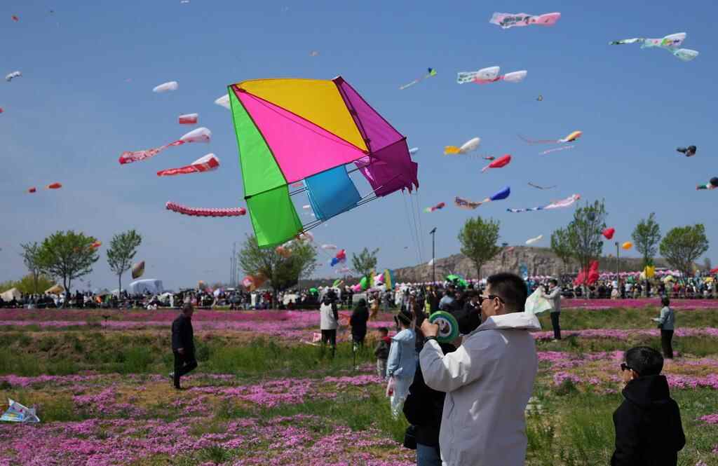 4月19日,在第42届潍坊国际风筝会万人风筝放飞活动上,风筝爱好者在放飞风筝。