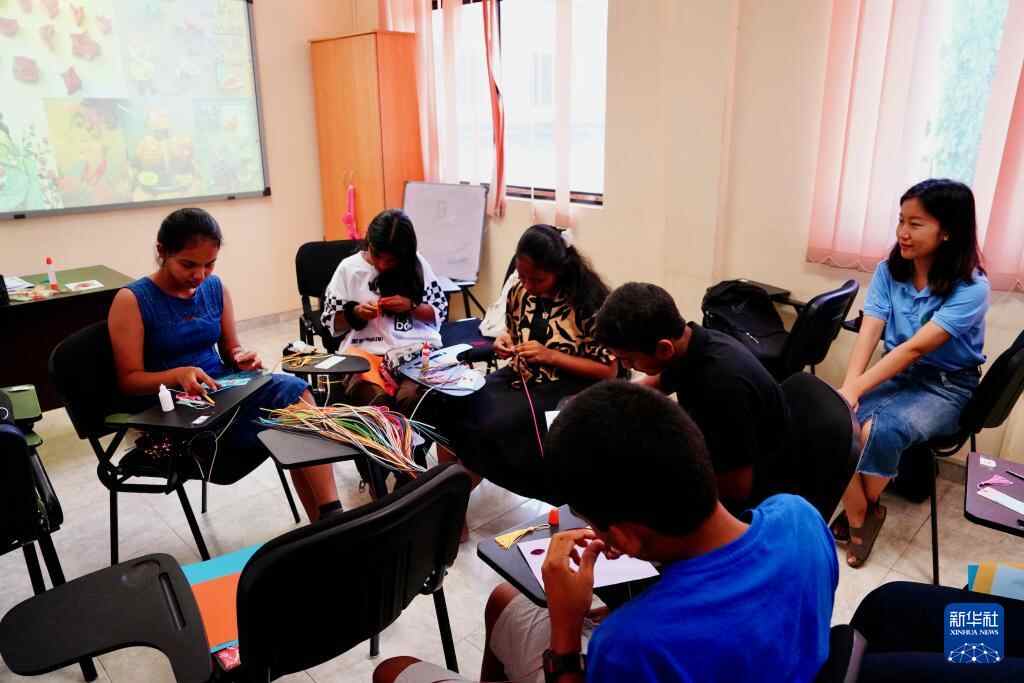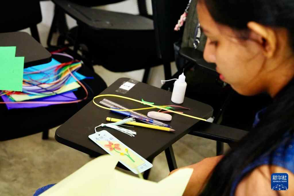 4月19日,在斯里兰卡首都科伦坡举行的联合国中文日活动上,兰比尼孔子课堂的学生学习制作衍纸书签。新华社记者 伍岳 摄