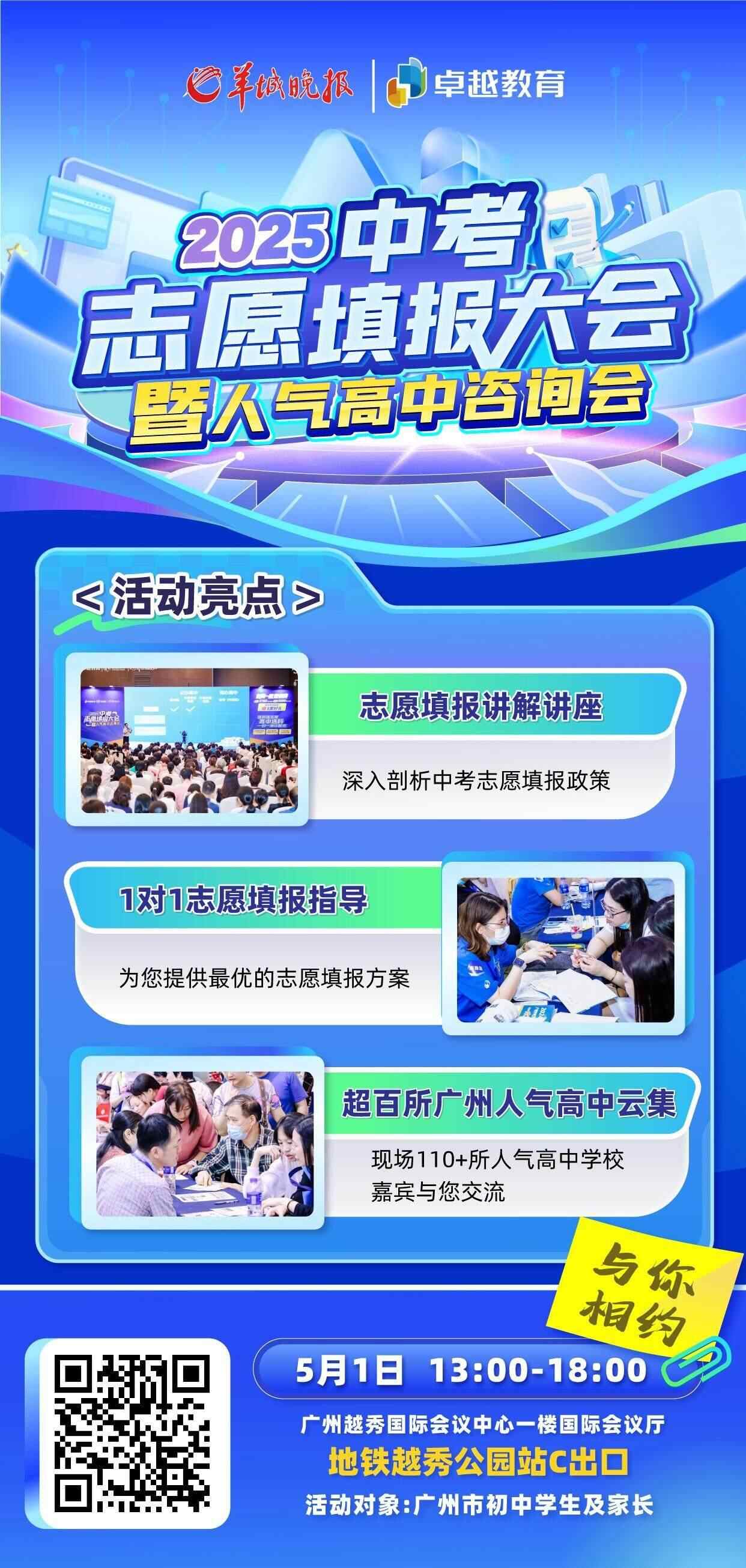 第二梯度有黑马校,685分捡漏成功?政策文件晦涩难懂,关键信息总抓不准?跑断腿参加开放日,学校信息还是凑不齐?志愿表改了十几版,还是担心“高分低就”或滑档?……中考升学关键局的“入场券”——5月1日(下周四)13:00-18:00,羊城晚报与卓越教育在广州越秀国际会议中心联合举办“中考志愿填报大会”,110+所高中招生官 + 中考卓越专家团手把手教你填志愿,让每1分都精准“砸”中理想高中。