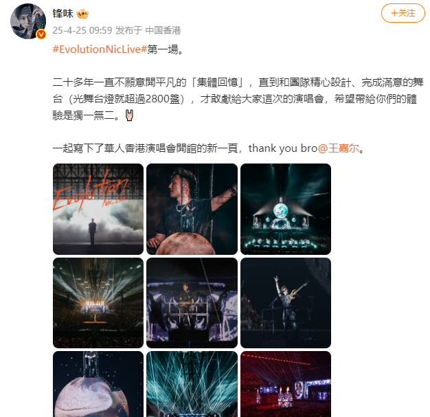 4月25日,谢霆锋在社交平台发文称:“二十多年一直不愿意开平凡的‘集体回忆’,直到和团队精心设计、完成满意的舞台(光舞台灯就超过2800盏),才敢献给大家这次的演唱会,希望带给你们的体验是独一无二。”