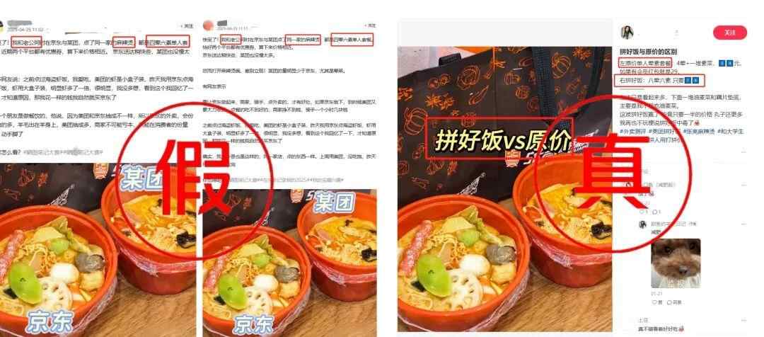 此外,美团还表示,“有骑手指出,若扫码放入外卖柜内,平台会获取跑单骑手的账号信息,对多平台跑单骑手的账号进行封禁”等不实信息。“不同平台分量缩水” 等相关内容也是恶意造谣,所谓的“对比图片”早在今年1月份就开始批量出现,与实际情况严重不符。
