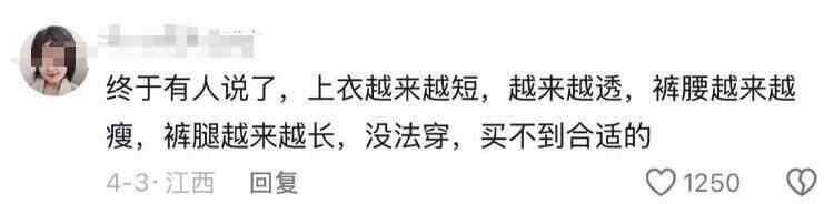 有网友在社交媒体分享:“同样体重几年前穿的还是M码,现在XL号穿着都费劲”,引发不少网友分享自己遭遇尺码“陷阱”的经历。