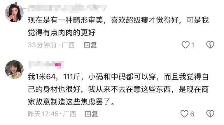 她进一步分析说,一方面,商家尺码越做越小,博主穿小码服装引流,都是因为有爆点,有人愿意为此买单;另一方面,这些商家和博主通过宣传再次加剧普通人的自我怀疑和焦虑——仿佛全网都是模特身材的人,自己穿不进小码衣服就是不健康、不美,甚至会以不健康的方式盲目减肥、追求所谓“完美身材”。