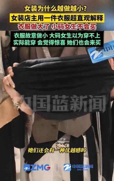 连日来,“女装为什么越做越小”相关话题引发不少网友热议。据媒体报道,有女装店主解释:“衣服做大了,小码女生不会买;衣服故意做小,大码女生以为穿不上但实际能穿,会觉得惊喜,她们也会来买。”