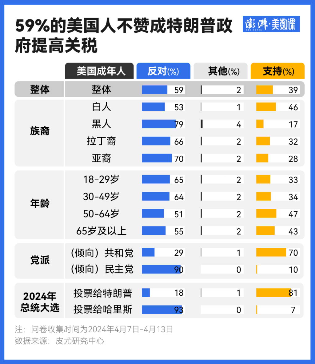一项由美国民调机构皮尤研究中心在4月7日至4月13日发起的“如何看待特朗普政府提高关税”的民调显示,美国受访者中有59%的人表示反对,其中强烈反对的人占比达到43%,而强烈支持的受访者仅有17%。除此之外,不同族裔、年龄段对关税战持反对态度的比例均超过50%,唯一例外的是在去年大选中投票给特朗普的选民,其对关税战的支持率高达81%。