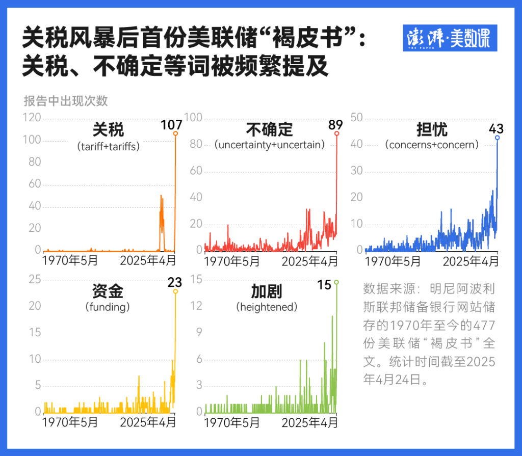 记者梳理了1970年以来美联储发布的470多份“褐皮书”发现,关税、不确定、担忧等词语在最新报告中的频次呈爆炸式增长——“关税”一共被提及了107次,和“不确定”有关的词语及其变体出现了89次。