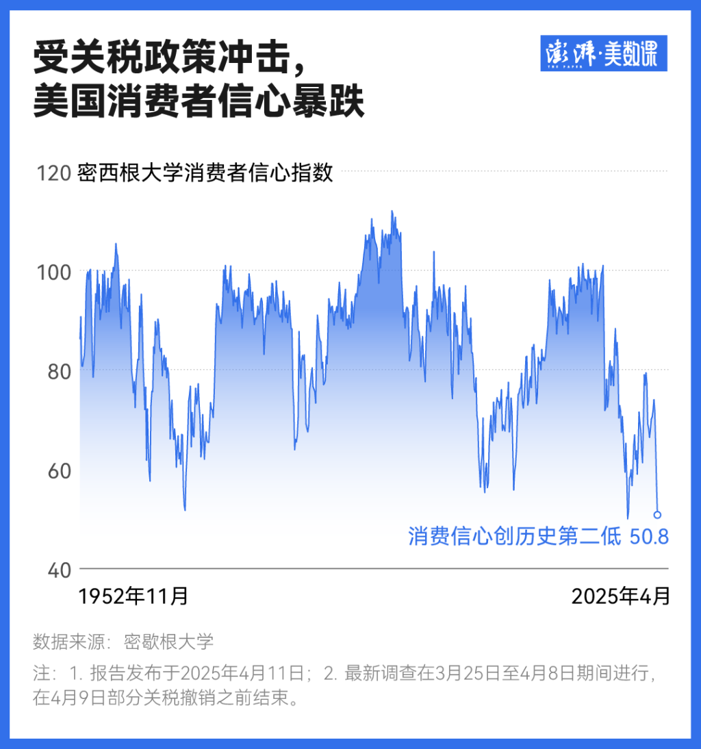 4月11日公布的密歇根大学4月份的初值数据显示,受特朗普关税政策的影响,美国4月密歇根大学消费者信心指数暴跌,初值为50.8,为2022年6月以来的最低值,也是1952年该调查设立以来的历史第二低。