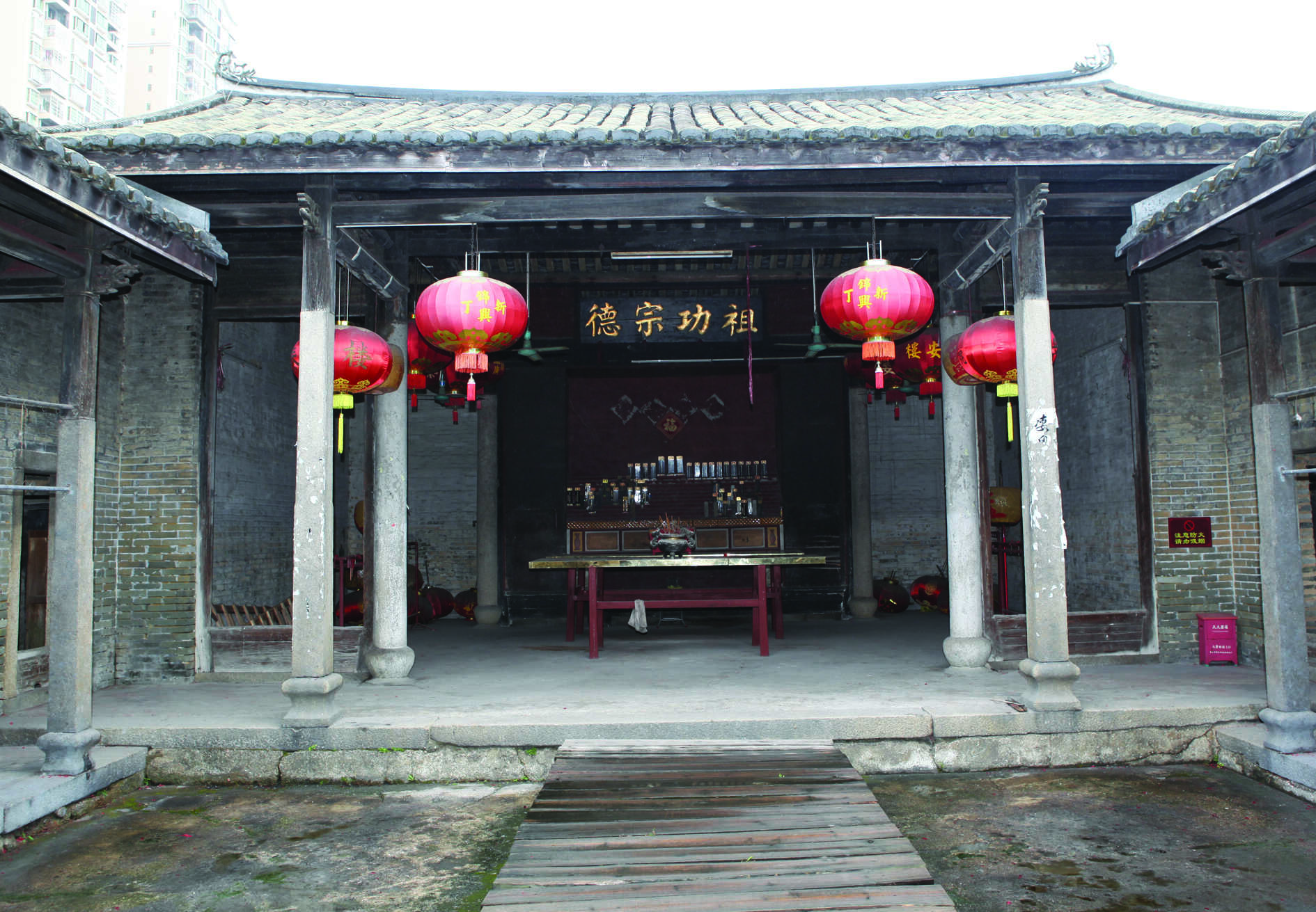 走进屋内,三层方形楼房组成“回”字形,四周向内设前走廊。位于“回”字正中央的是祭祀用的祠堂,堂内横匾上书“祖功宗德”,陈列着蓝氏先祖神主牌。