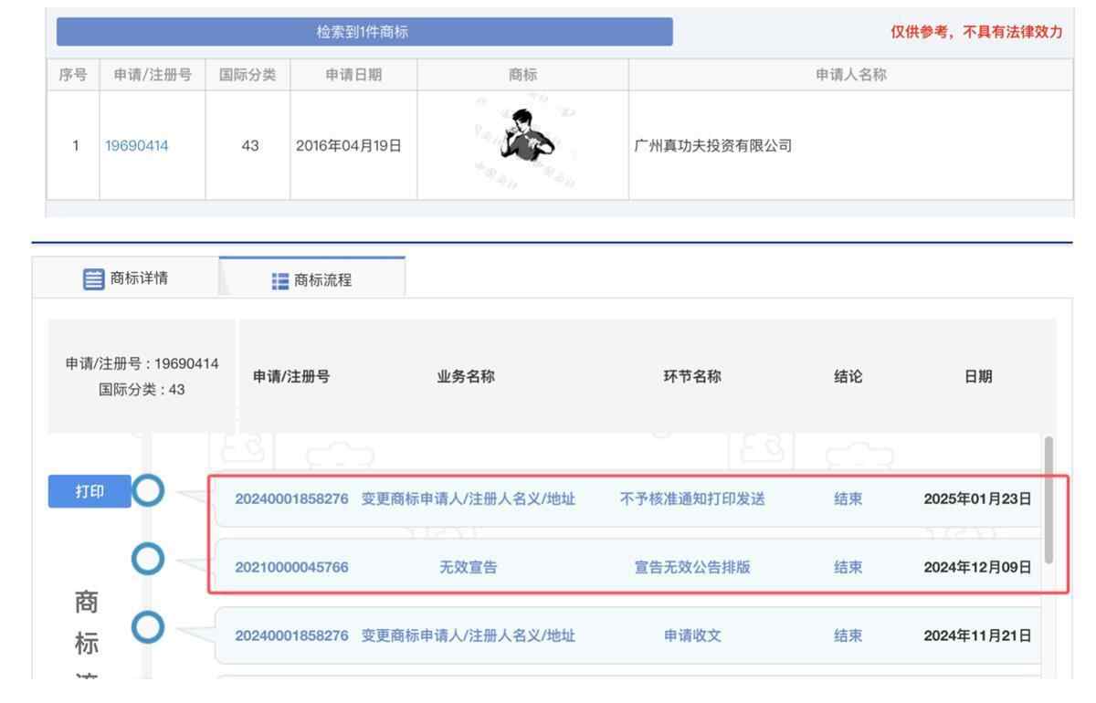26日,记者通过中国商标网查询上述争议商标发现,第6295470号、第19690414号商标于2024年12月已处于“无效宣告”状态。