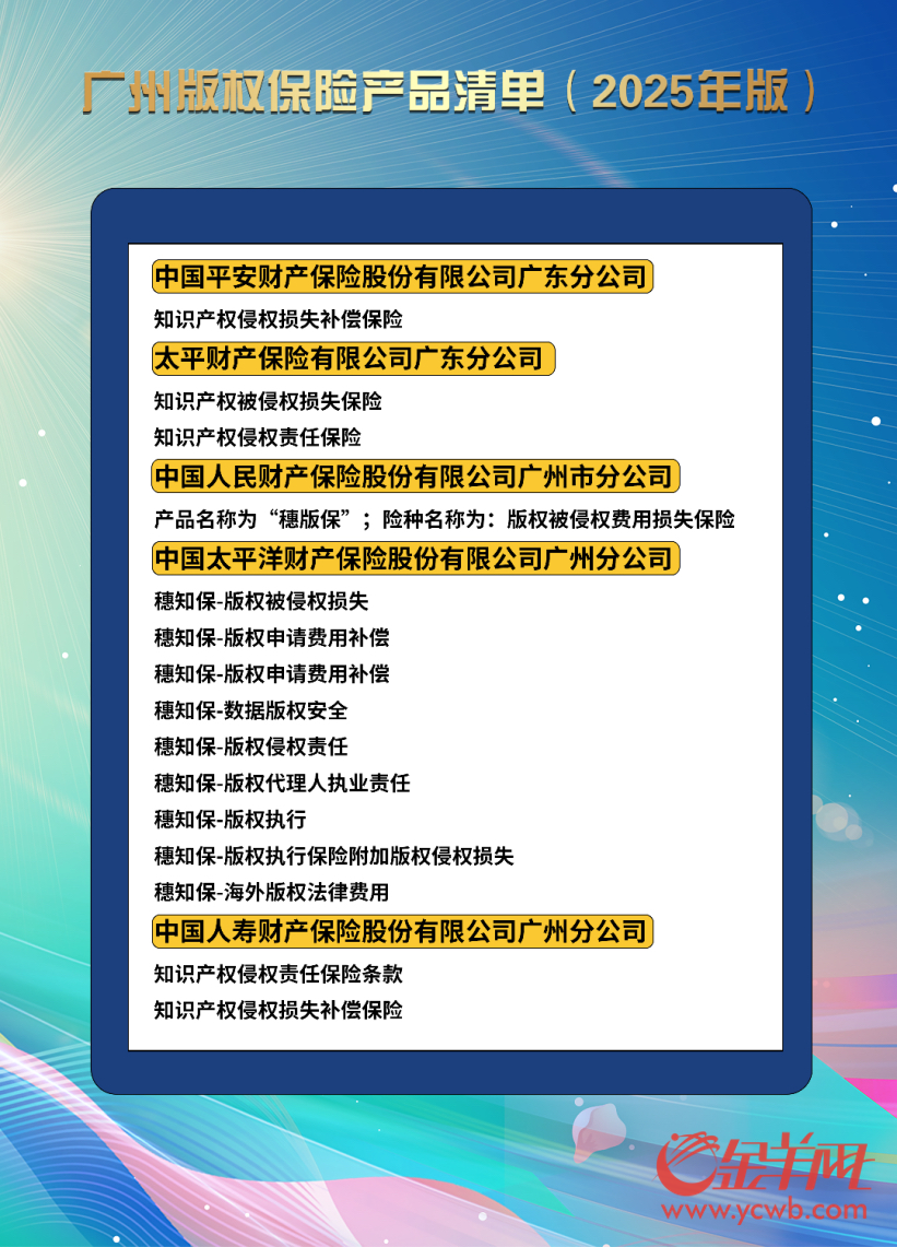 为做好知识产权金融生态综合试点工作,鼓励保险机构为知识产权创新企业提供综合保险方案,全面开展知识产权转化运用类、海外维权类等保险业务。活动现场,中国平安财产保险股份有限公司广东分公司、太平财产保险有限公司广东分公司、中国人民财产保险股份有限公司广州市分公司、中国太平洋财产保险股份有限公司广州分公司、中国人寿财产保险股份有限公司广州分公司等5家保险公司,通过录制视频的形式发布宣言,展现保险赋能版权产业高质量发展新气象。