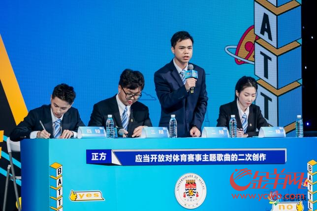 决赛现场硝烟骤起,首次参赛就晋级决赛的澳门大学和第四届、第六届冠军队伍广东财经大学强强相遇,他们围绕“应该放开还是限制对体育赛事主题歌曲的二次创作”展开锋芒对决。