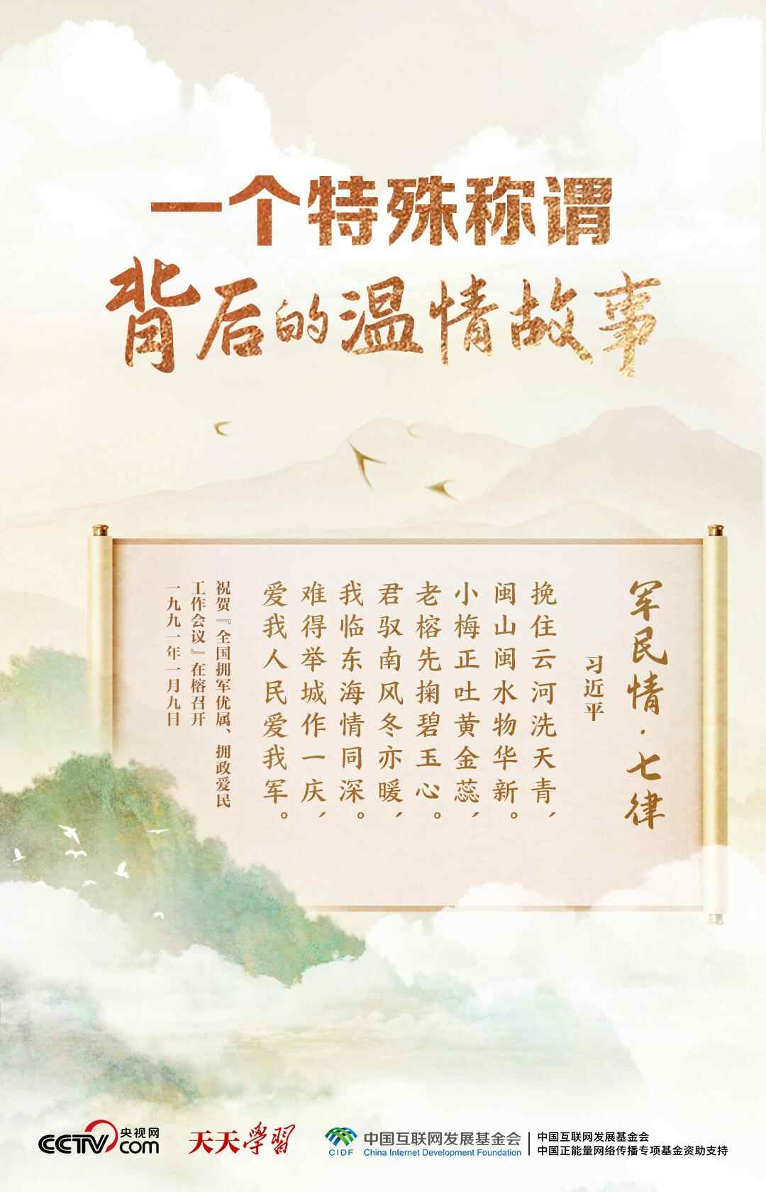 当年在福州工作时,习近平曾赋诗《军民情·七律》,表达了他对军队的深情:“君驭南风冬亦暖,我临东海情同深。难得举城作一庆,爱我人民爱我军。”