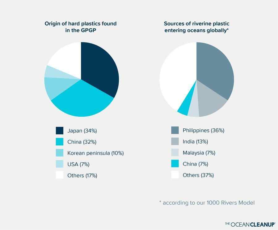这些塑料垃圾中,有230个带有可识别的不同语言文字、品牌标志或其他线索(如地址)的塑料物体。在对这些物体进行单独检查后,研究人员发现,物品中标明的主要原产国/地区是日本(34%),其次是中国(32%)、朝鲜半岛(10%)和美国(7%)。这些国家或地区大多不被认为是河流塑料排放到海洋的主要来源,却是北太平洋地区工业化捕鱼活动的主要场所。