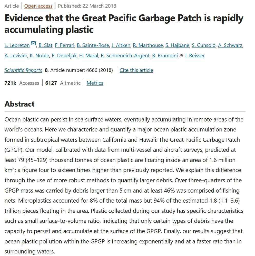 2018年,荷兰非营利组织“海洋清理”(The Ocean Cleanup)的研究人员在《自然》杂志发表文章。他们通过船只采样和飞机摄影得到数据,预测在北太平洋垃圾带160万平方公里的区域内,漂浮着7.9万吨海洋塑料垃圾。