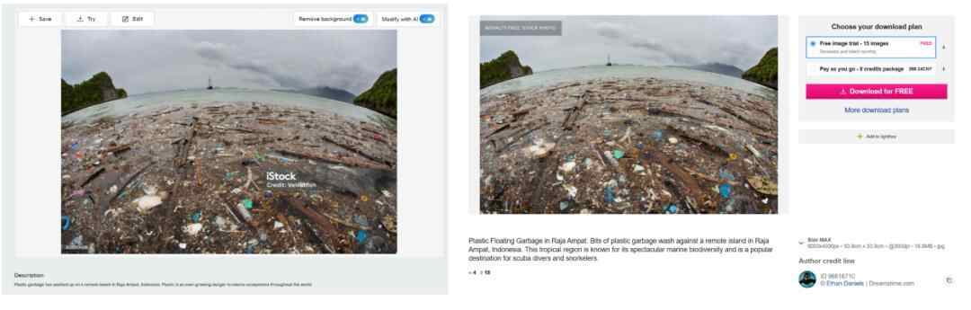 Istock网站提供的信息显示,丹尼尔斯在2017年7月上传了这一图片。此图拍摄于位于太平洋和印度洋交界处的印度尼西亚四王群岛(Raja Ampat)附近,反映了当地一个偏远海滩上漂浮着的塑料垃圾。