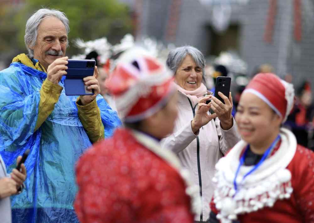 4月12日,外国游客在贵州省黔东南苗族侗族自治州台江县举行的“苗族姊妹节”庆祝活动上拍摄。新华社记者刘续 摄