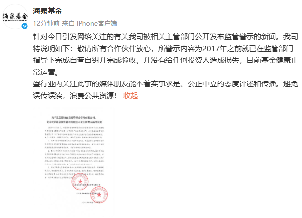 对此,4月24日下午,海泉基金在微博发布声明回应称,所警示内容为2017年之前就已在监管部门指导下完成自查自纠并完成验收。并没有给任何投资人造成损失,目前基金健康正常运营。