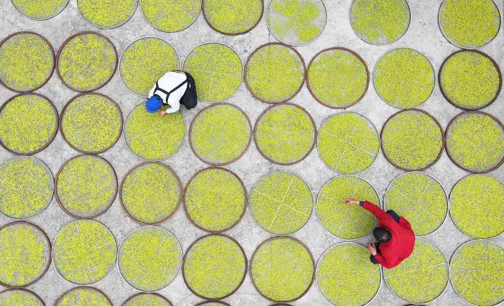 4月7日,在湖南省永州市双牌县上梧江瑶族乡盘家村云台山生态有机茶园,茶农在摊晒春茶(无人机照片)。新华社发(何红福摄)