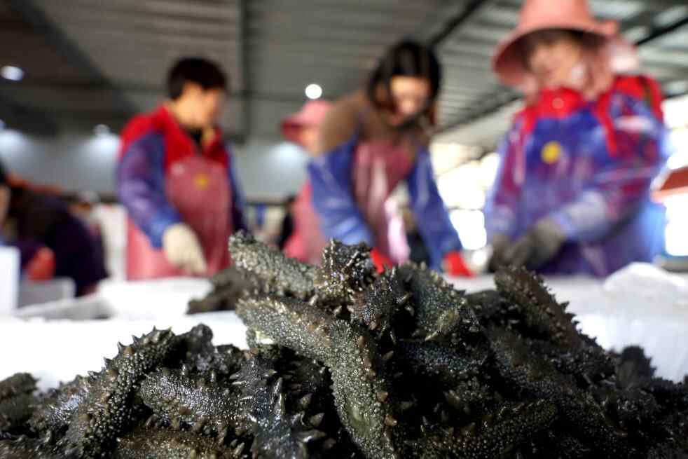 4月14日,在霞浦县溪南镇一家水产养殖企业,工人在分拣、包装海参。新华社发(王旺旺 摄)